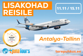 Meil on heal meel teatada, et novembris on lisatud lisakohad suunal Antalya-Tallinn kuupäevadel 11.11.2024 ja 15.11.2024. Väljumine Antalyast kell 10:20, saabumine Tallinnasse kell 13:30 lennufirmaga SunExpress Väljalend 05.11.24 - 6 ööd (tagasilend 11.11)AMBASSADOR PLAZA HOTEL 4* AI 620€ vaataEUPHORIA BARBAROSS BEACH RESORT 5* UAI 665€ vaataLONICERA WORLD HOTEL 4* UAI 689€ vaataMA BICHE KEMER BY WERDE HOTELS 5* UAI 695€ vaataHAYDARPASHA PALACE 5* UAI 722€ vaataMARTI MYRA HOTEL 5* UAI 749€ vaataIC HOTELS GREEN PALACE 5* UAI 758€ vaataJUJU PREMIER