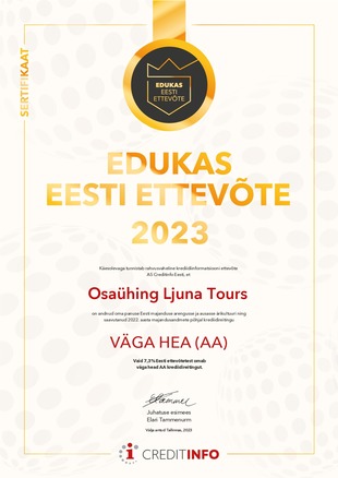 Meil on suur rõõm teatada, et Ljuna Tours (Tere Puhkust haldav ettevõte) on oma majandustulemuste põhjal saanud krediidireitinguga AA (Väga hea) "Edukas Eesti Ettevõte 2023" sertifikaadi. Tunnistus on tõestuseks Ljuna Toursi panusest Eesti majanduse arengusse ja ausasse ärikultuuri.