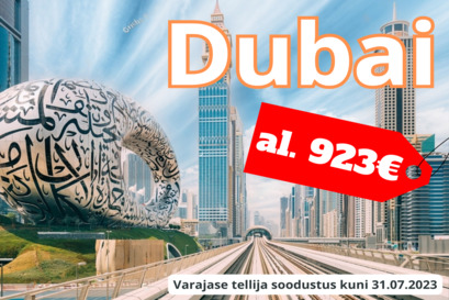 Alates 26. detsembrist kutsume reisile unustamatusse DUBAIsse: kus Ida kohtub Läänega, eksootika kohtub modernismiga, minevik kohtub tulevikuga. Lennud toimuvad lennufirmaga Air Baltic ümberistumisega Riias.• Uued ja kvaliteetsed lennukid;• Mugavamad istmed;• Hinnas pagas (23 kg) ja käsipagas (8 kg). Beebile - 10kg + lapsevanker.Pakume majutust hotellides, mis asuvad mitte ainult Dubais, vaid ka teistes atraktiivsetes emiraatides, nagu Abu Dhabi, Ajman, Fujairah, Ras Al Khaimah ja Sharjah.Reisipaketi näidishinnad:Flamingo Beach Resort 3* (Ras Al Khaimah) hommikusöögiga al. 923 €/inOceanic Khorfakkan Resort & Spa