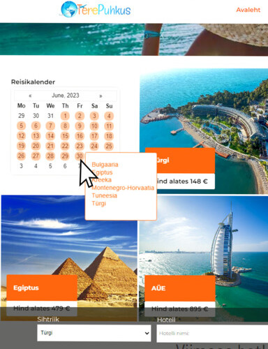 🔎 Ei tea kuhu reisile minna? Meie reisikalender aitab teil seda probleemi lihtsalt ja mugavalt lahendada. 📅 Lihtsalt suunake kursor teid huvitava kuupäeva peale ja kalender kuvab kohe kõik sellel päeval saadaolevad lennud. Ükskõik, kas otsite romantilist puhkust valgel liivarannal või põnevat seiklust mägedes. 🌟Ärge raisake aega lõpututele otsingutele – meie reisikalender aitab teil leida ideaalse valiku. Alusta oma reisi juba täna!🌟 📢Külastage meie kodulehte ja avastage uusi horisonte: www.terepuhkus.ee 🌎✈️🏖️ 💌Meie professionaalsed konsultandid vastavad teie küsimustele info@terepuhkus.ee