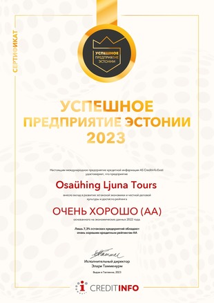 Рады сообщить, что Ljuna Tours (управляющая компания Tere Puhkus) награждён сертификатом "Успешное предприятие Эстонии" за 2023 год. Сертификат является доказательством вклада Ljuna Tours в развитие экономики Эстонии и честной деловой культуры. Присвоенный нам рейтинг AA (очень хорошо).